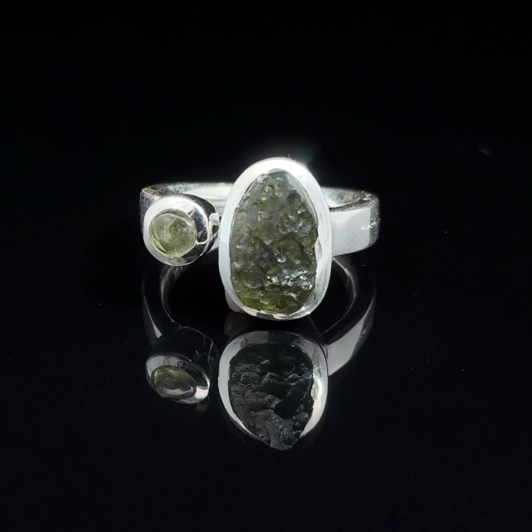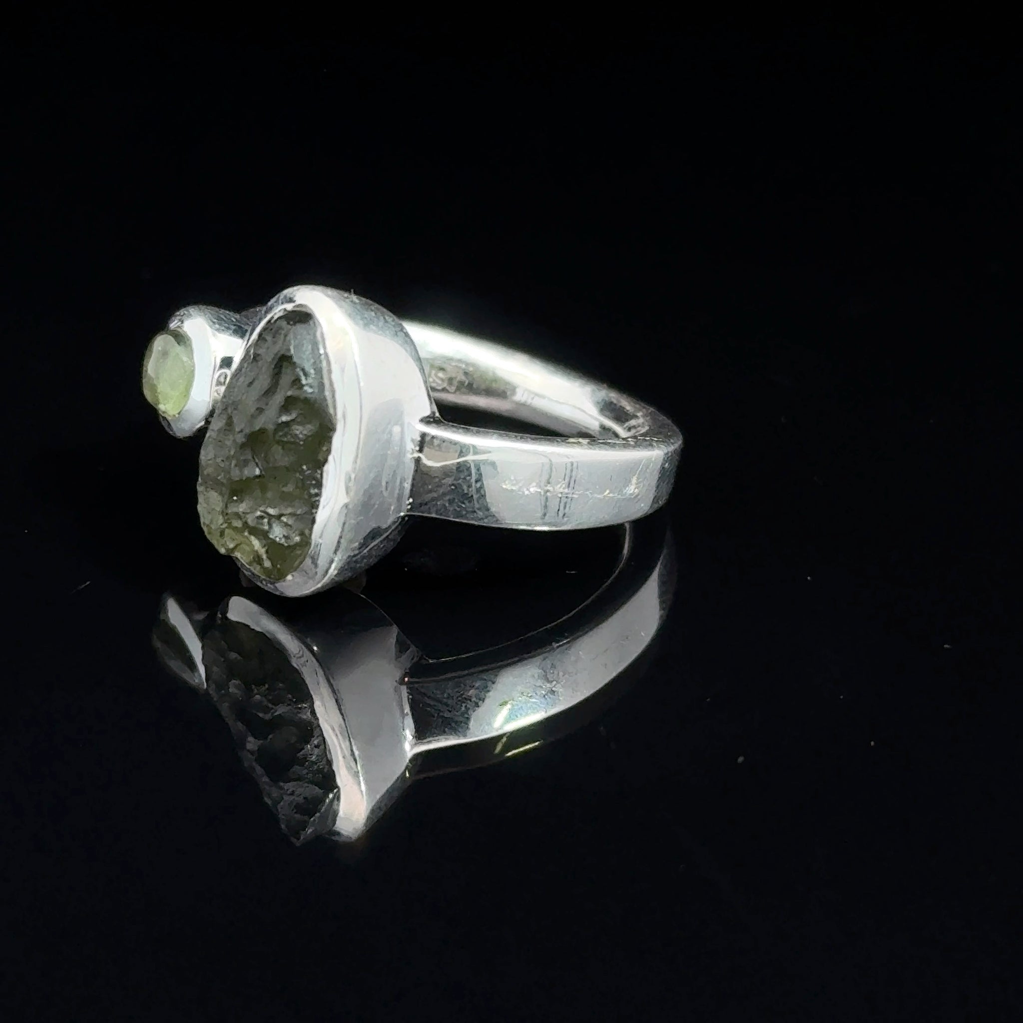 Кольцо Молдавит дикий и обработанный размер; серебро 925