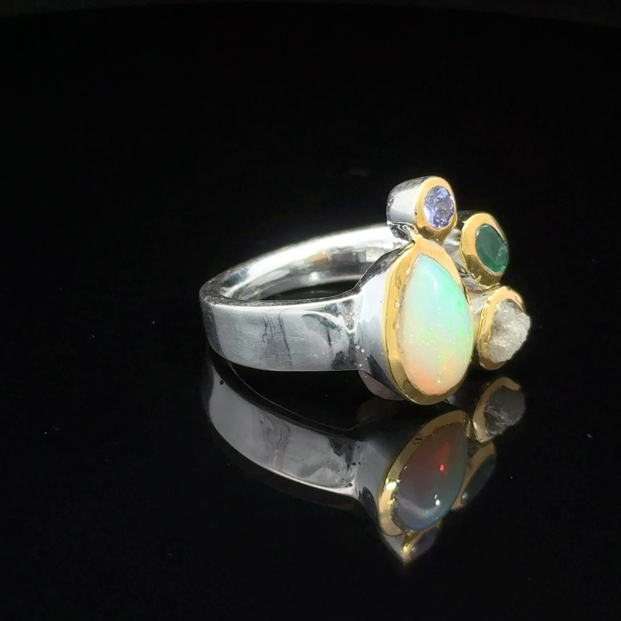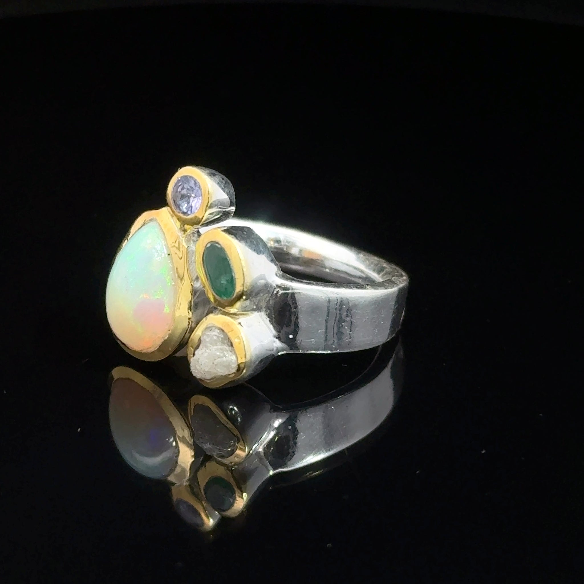 Кольцо Опал благородный эфиопия, изумрад, алмаз, танзанит 18 размер; серебро 925