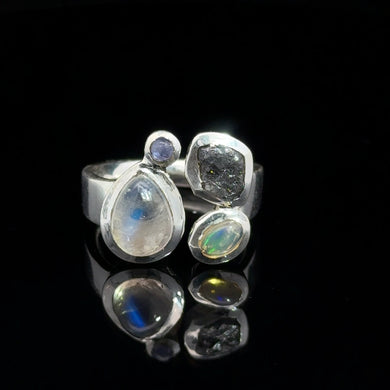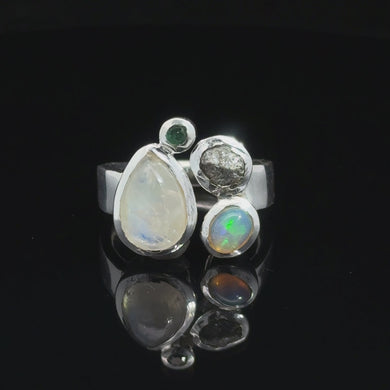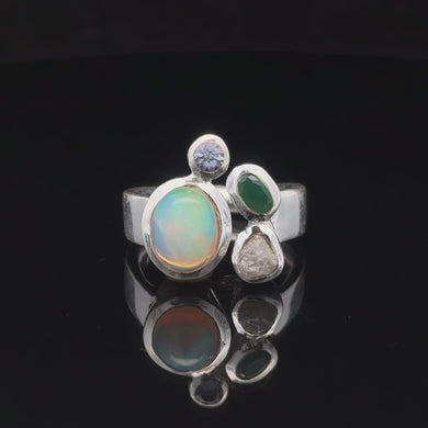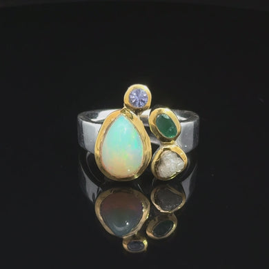 Кольцо Опал благородный эфиопия, изумрад, алмаз, танзанит 18 размер; серебро 925