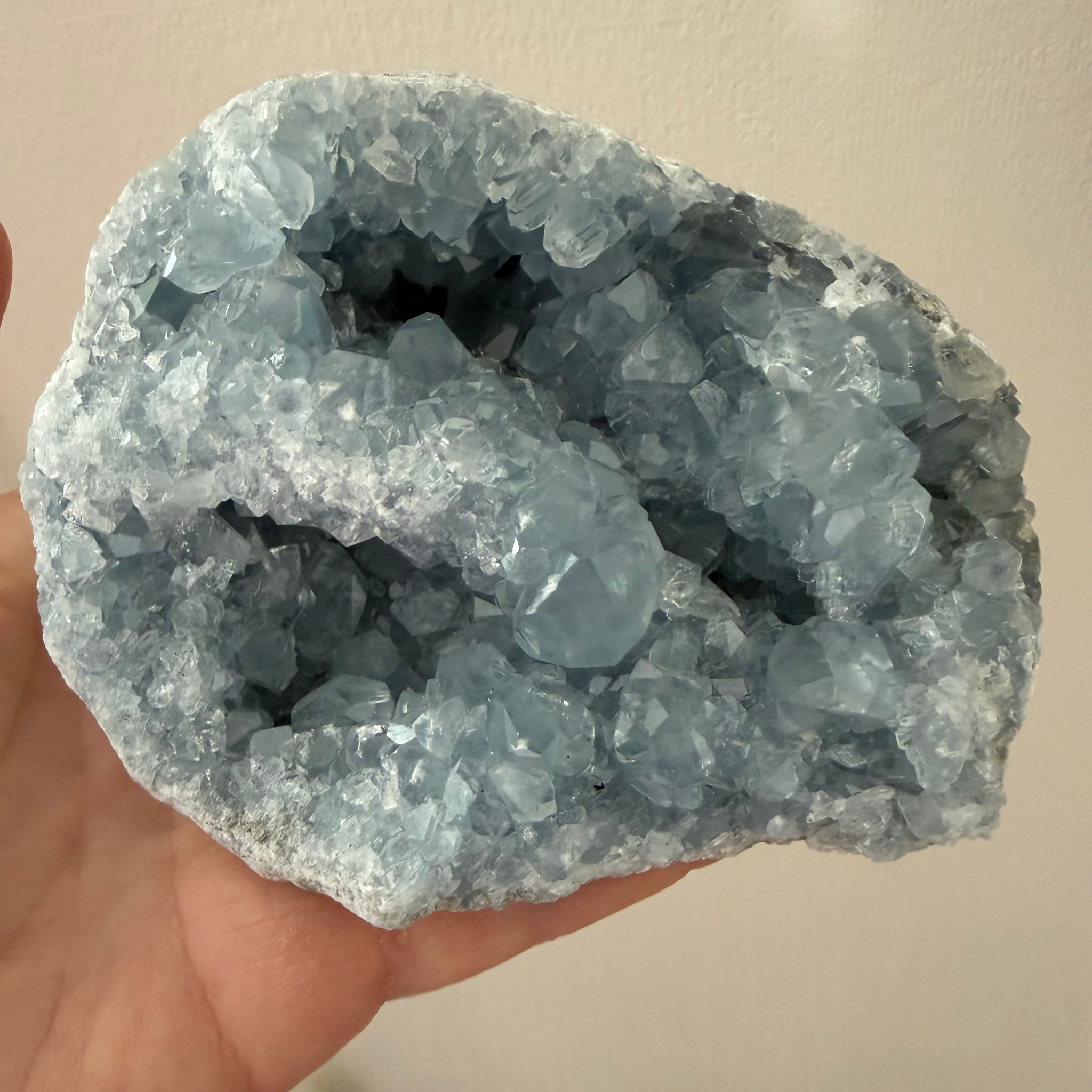 This natural celestine crystal specimen features soft sky-blue crystals with a delicate natural structure. The mineral is valued for its gentle color and sparkling crystal surfaces. Such celestine formations are appreciated by collectors and also work well as decorative mineral pieces.