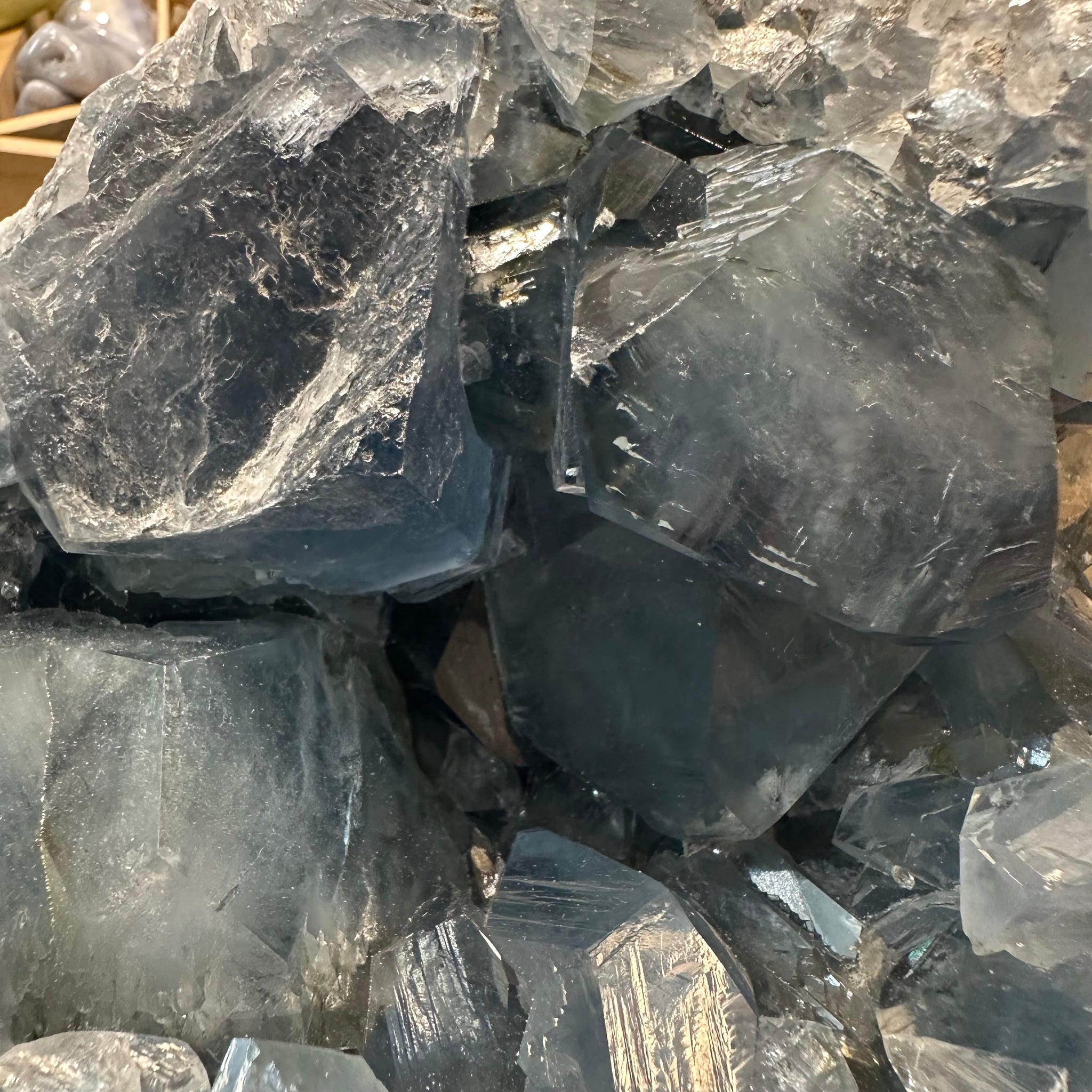 This impressive natural celestine druze features clusters of delicate sky-blue crystals forming a striking mineral specimen. The large size and sparkling crystal surface highlight the natural beauty of celestine formations. Such specimens are highly appreciated by mineral collectors and serve as remarkable natural decor pieces.