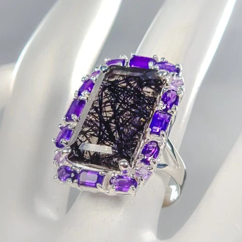 • Lejupielādēt attēlu galerijas skatītājā, Kvarca gredzens ar melnu turmalīnu 27 karāti, 22x13 mm, 12,7 g, ametisti, 18. izmērs; 925. proves sudrabs