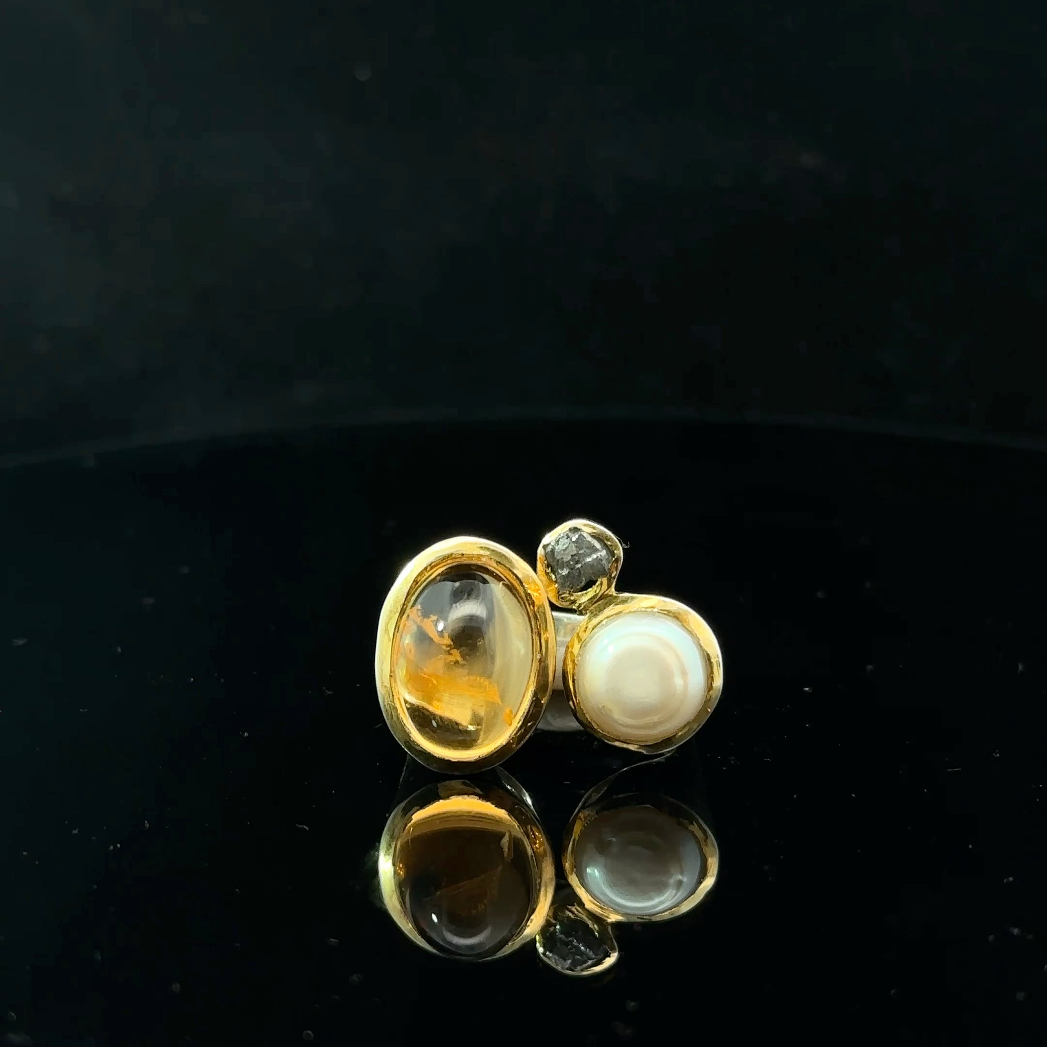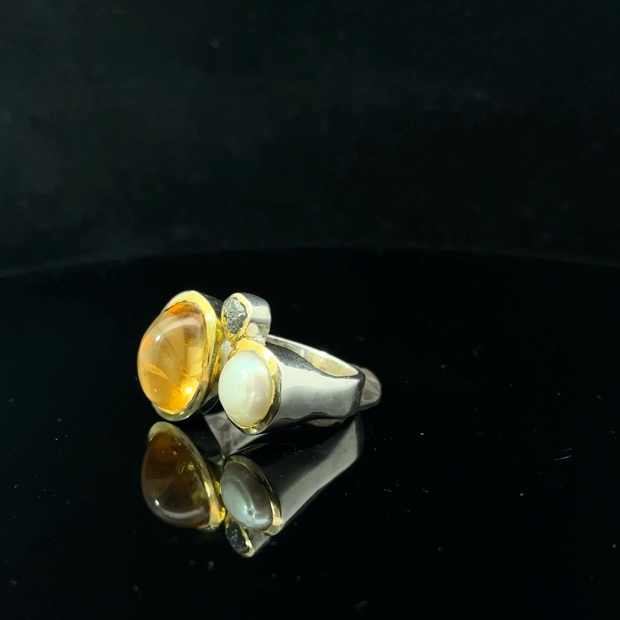 • Lejupielādēt attēlu galerijas skatītājā, Citrīna, pērļu un dimanta gredzens, 19. izmērs; 925. proves sudrabs